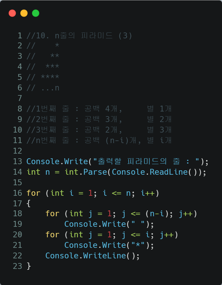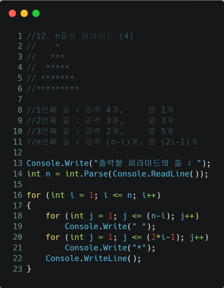 i가 1부터 star개까지 1씩 증가하며 (star 줄)