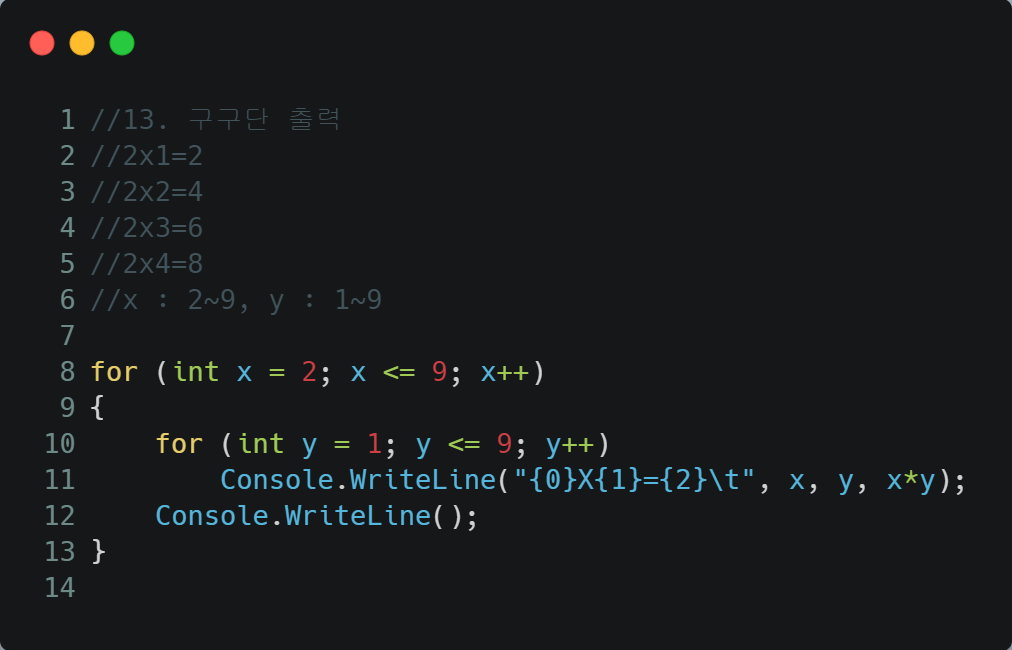Console.WriteLine("2x{0}={1}", i, 2*i);