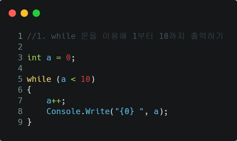 5. a가 10보다 작은 동안 a를 1씩 증가시키며 출력