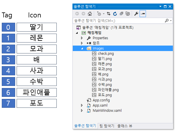 2. `string fruit = "../../Images/" + icon[(int)btn.Tag];`: 클릭된 버튼의 태그를 사용해 `icon` 배열에서 과일 이미지 경로 가져오기