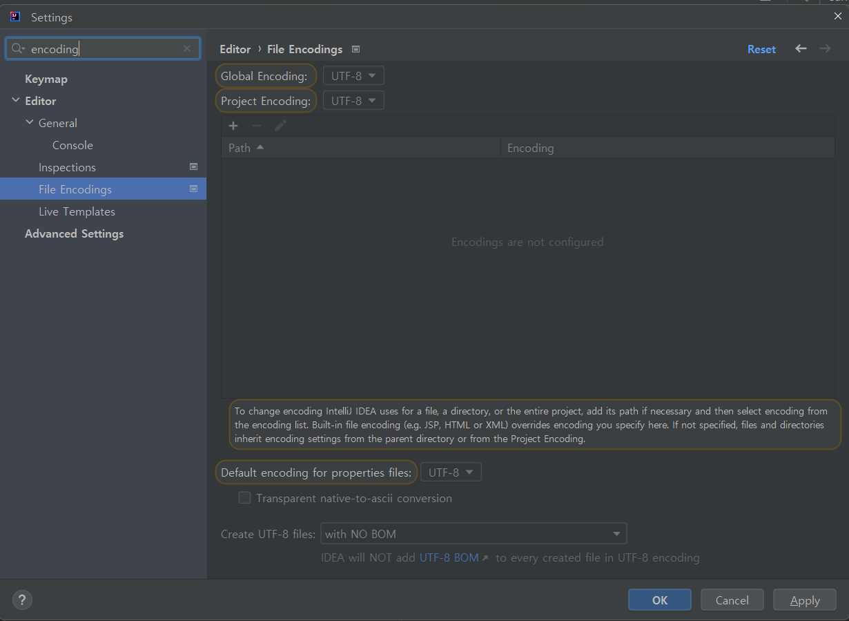 encoding > UTF-8로 설정 -> 한글깨짐 방지