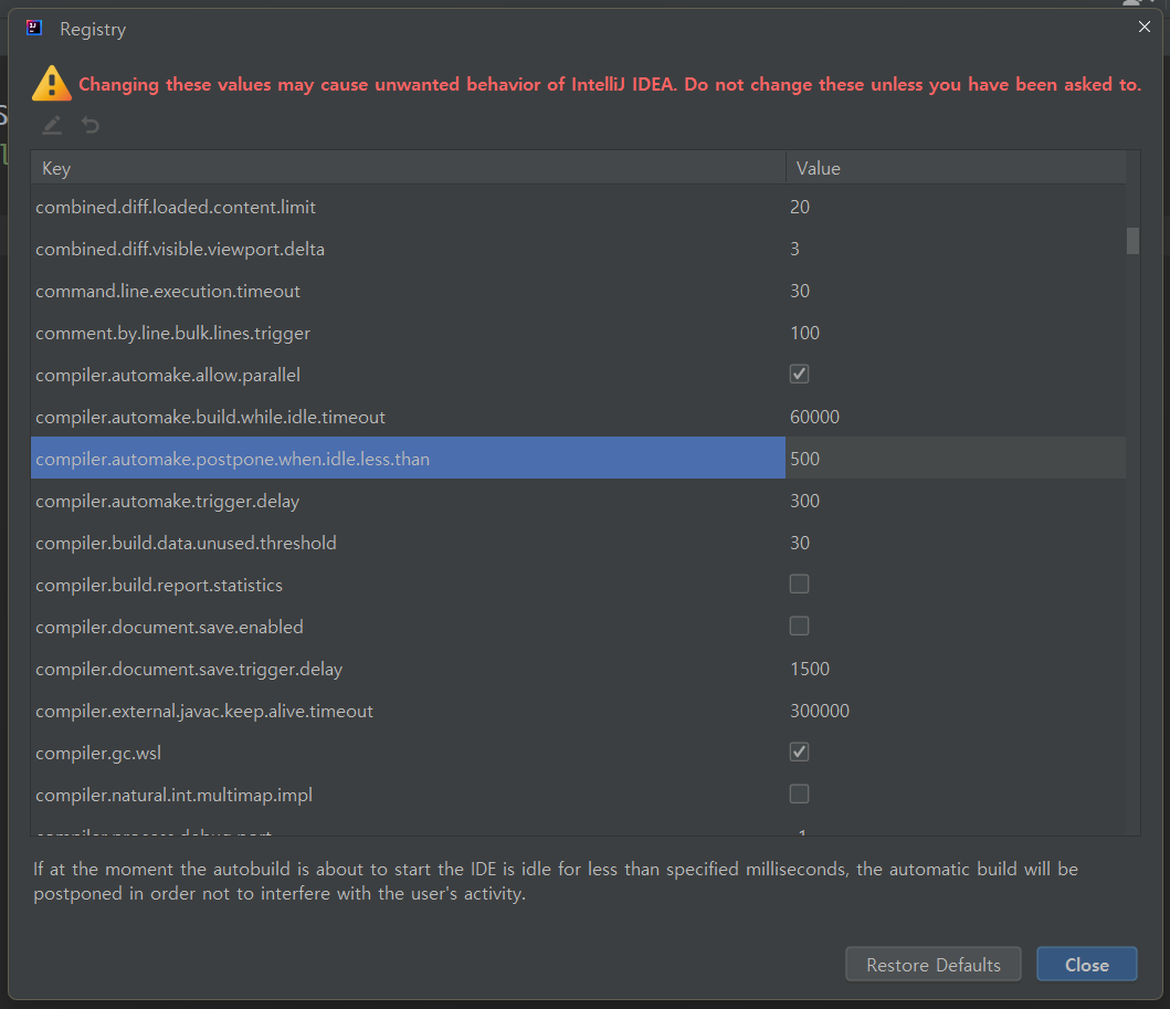 shift 두 번 눌러 registry 검색 후 해당 숫자 500으로 변경