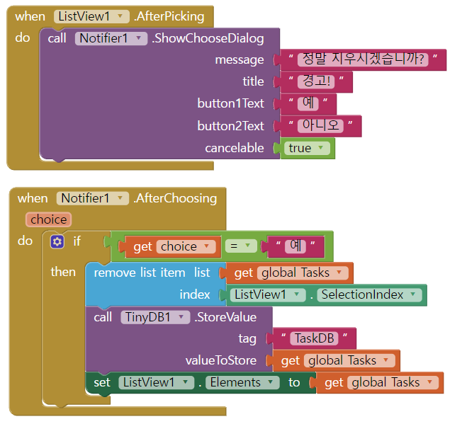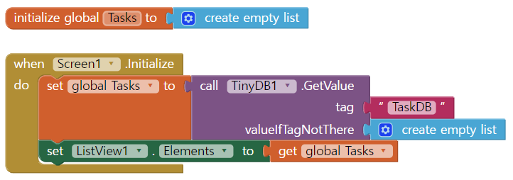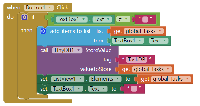 add items to list 블록으로 TextBox.Text을 Tasks 리스트에 추가