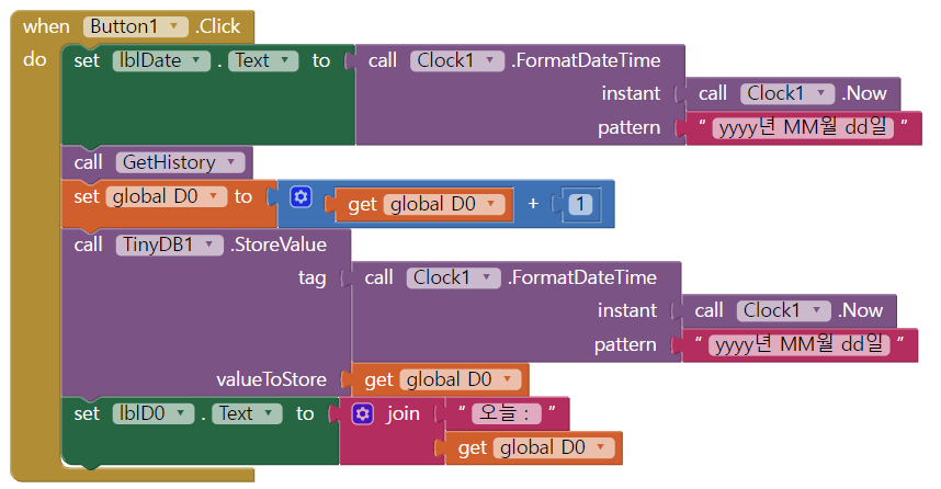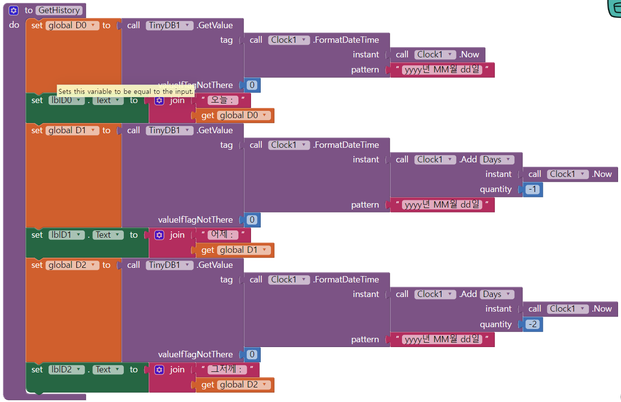 프로시저가 실행되면 D0(오늘)변수에 날짜를 태그로 받아 TinyDB를 받아와 D0값을 출력한다.