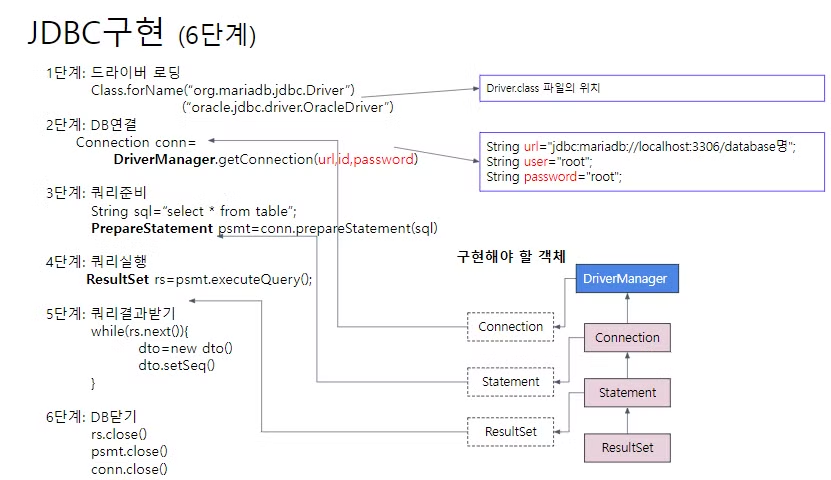 - Class.forName : 드라이버 로딩, JDBC 드라이버를 메모리에 로드하여 데이터베이스와의 연결을 가능하게 함