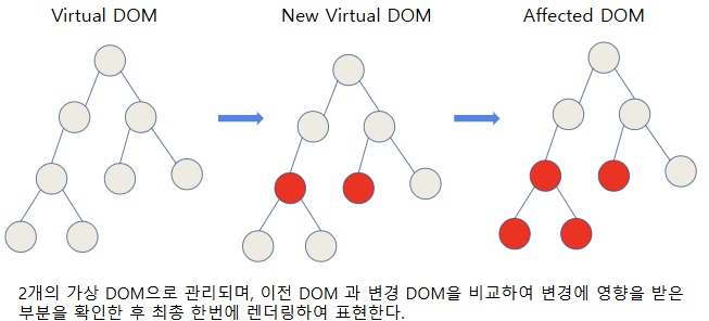 Virtual DOM: 실제 DOM 대신 가상의 DOM을 사용하여, 변경 사항을 효율적으로 업데이트한다.
