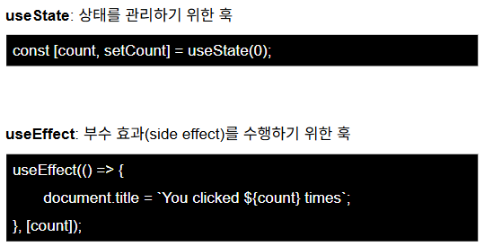 - 함수형 컴포넌트에서 상태와 생명주기 기능을 사용할 수 있게 하는 기능