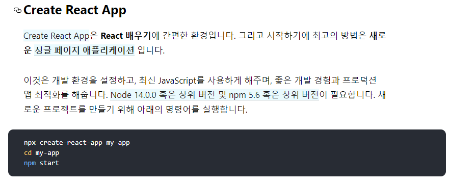리액트 홈페이지(https://ko.reactjs.org/docs/create-a-new-react-app.html)에서 create a new react app 메뉴를 클릭하면 다음과 같은 화면이 나온다.