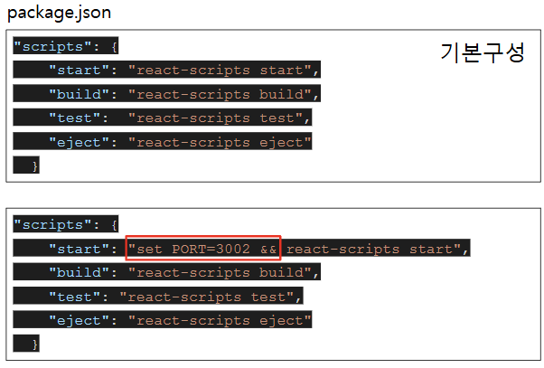 - 기본 port는 3000으로 설정되어 있으며, 변경시 아래와 같이 package.json 파일에서 원하는 port번호로 변경하면 된다.